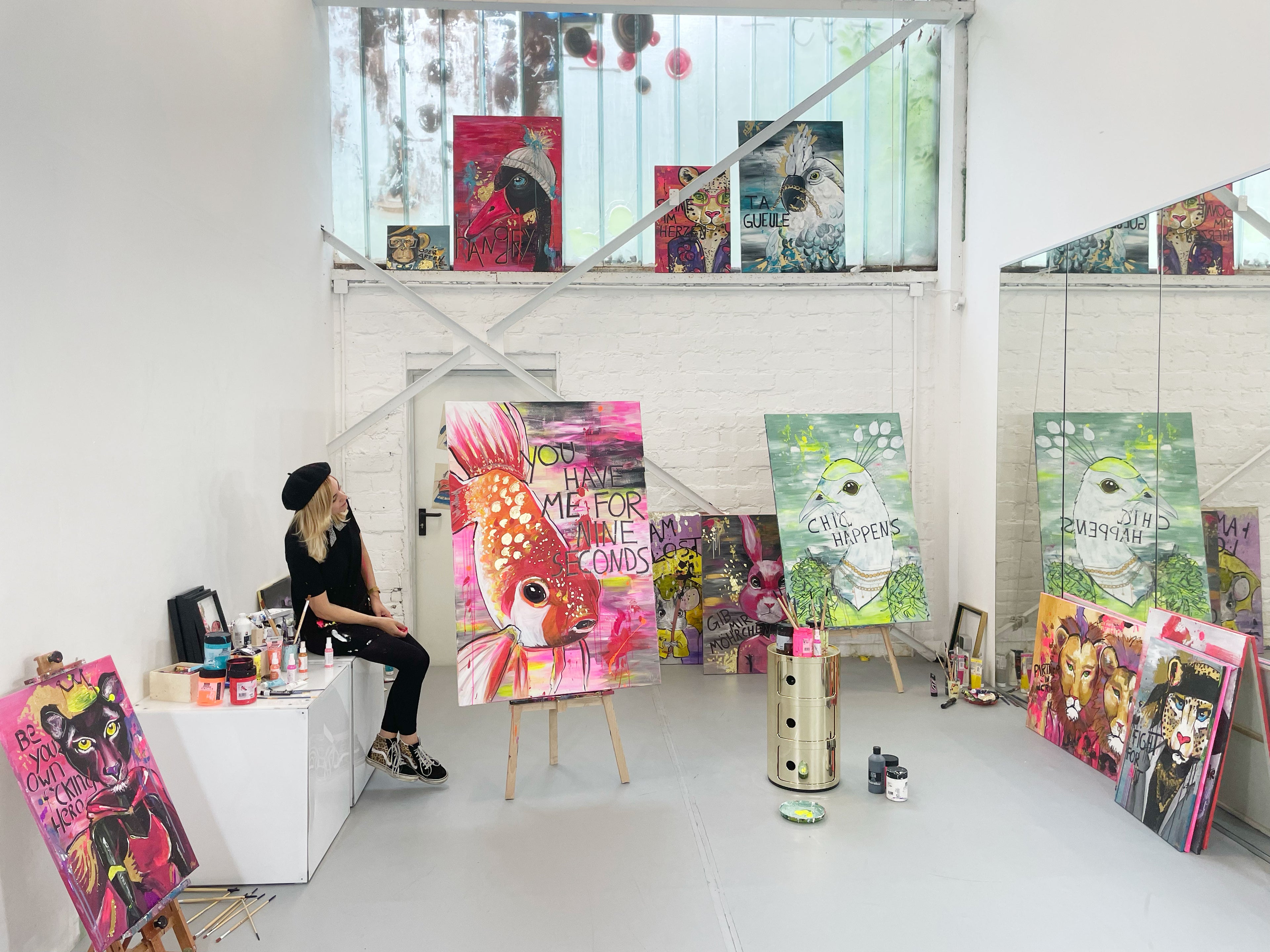 In ihrem kreativen Prozess nutzt Nadine moderne Technologien, um ihre Ideen mithilfe von Künstlicher Intelligenz zu konkretisieren. Ihre Maltechnik kombiniert leuchtende Farben, faszinierende Charaktere und treffende Texte, ergänzt durch ein glamouröses Blattgold-Finish.